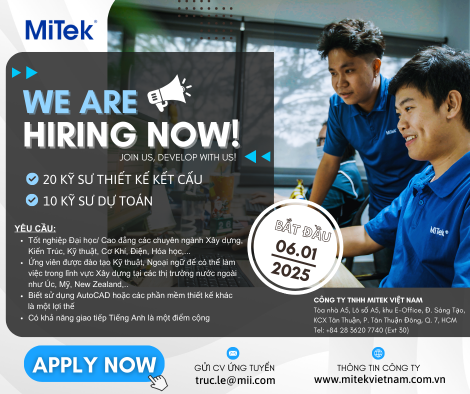 Công ty TNHH MiTek Việt Nam tuyển dụng các vị trí thiết kế, Rendering và thiết kế kết cấu