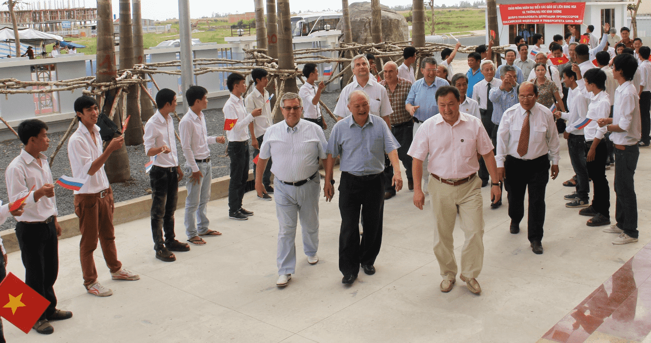 GS.VS Ogay S.A – Hiệu trưởng Trường Đại học Quốc gia Hàng hải Nhevelsky ; GS.VS Solinov – Phó Chủ tịch Viện Hàn lâm Khoa học Công nghệ Liên bang Nga và các GS.VS đến thăm chi nhánh Trường Đại học Bình Dương tại Cà Mau.